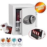 Tresor Safe Feuerfest, Phönix Titan II FS1272E, feuerfester Wandtresor Brandschutztresor 420 x 352 x 433 mm, inkl. feuerfeste Schutztasche, Modell 2013 KaufenTresor Safe Feuerfest, Phönix Titan II FS1272E, feuerfester Wandtresor Brandschutztresor 420 x 352 x 433 mm, inkl. feuerfeste Schutztasche, Modell 2013 NEU! Titan II Security Fire Safe bietet Feuerschutz für Ihre wichtigen Papierdokumente oder Digitale Speichermedien. Galvanisierte Stahlplatten verhindern das Eindringen von Feuer und Hitze. Eigenschaften: 60 Minuten Feuerschutz für Papierdokumente gem. schwedischem NT FIRE 017-60P Standard (bis 1000°C) und Digitale Speichermedien (CDs, DVDs, USBs) gem. MTC-DIP120-60DMA (bis 945°C) elektronisches Hochsicherheitsschloss mit LED Display (bis zu 6 Ziffern programmierbar) mit integriertem, einfachen Alarm (verursacht einen Signalton bei Erschütterungen und bei 4 aufeinander-folgenden Fehlversuchen der Codeeingabe) Sturz-getestet (9,15m) empfohlen für Bargeldrisiko bis 2.500 EUR. (Versicherungswerte können lokal varrieren) Farbe: Weiß kratzfest beschichtet (RAL9003) Ausstattung Schlüsselhakenleiste auf Türinnenseite bietet Platz